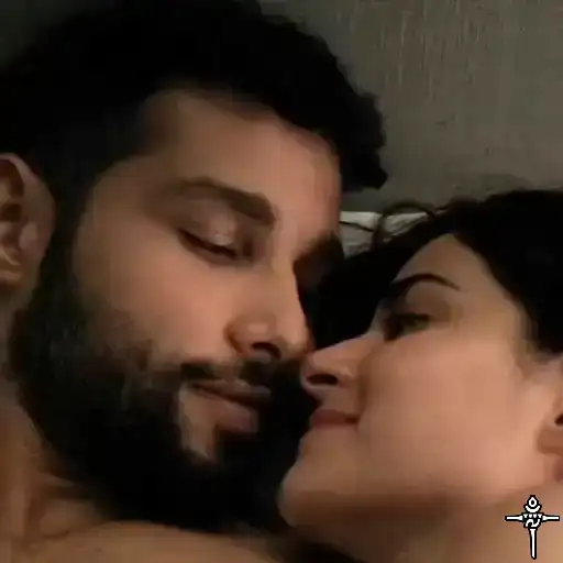 Casal íntimo em uma cama, com a mulher deitada e o homem sentado ao lado, ambos nus da parte superior do corpo.