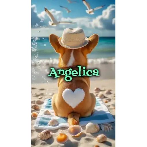 Um canguru fofinho sentado na praia, usando um chapéu e com um coração no bumbum. O cenário inclui seagulls, conchas e um mar azul.