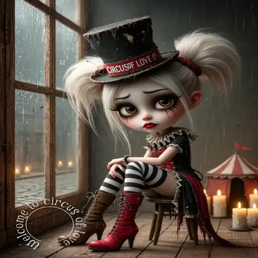 Uma mulher com penteados duplos e maquiagem pesada, vestindo um chapéu preto com 'Pieces of Love', um bodysuite…