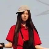 Mulher com expressão surpresa ou preocupada, mão no pescoço, lábios rosa, cabelo castanho.