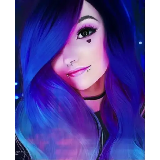 Rosto de uma jovem mulher com cabelo azul roxo e maquiagem colorida, olhar suave e sorriso leve.