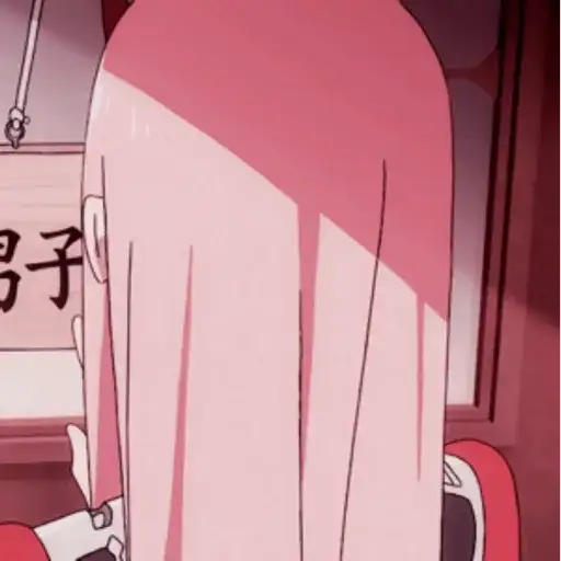 Uma garota de anime com cabelo rosa e um fundo rosa, com caractere japonês no fundo.