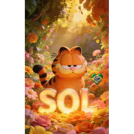 Gato laranja com manchas pretas em um jardim de flores coloridas. O gato tem um olhar relaxado e o texto 'IVANILDA' em…