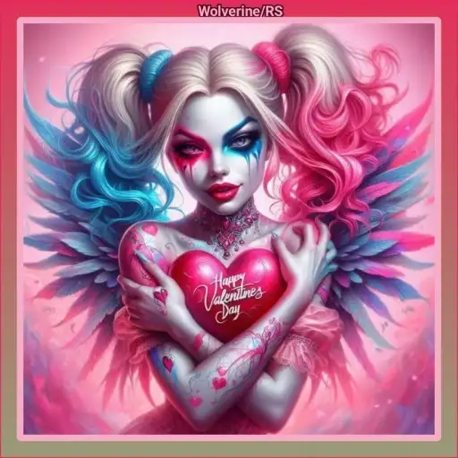 Uma mulher com cabelo rosa e azul, maquiagem colorida e asas, segurando um coração vermelho com a frase 'I Love You'…
