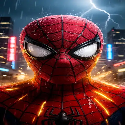Homem-Aranha com expressão séria, usando traje vermelho e preto, em frente a uma cidade à noite com raios.