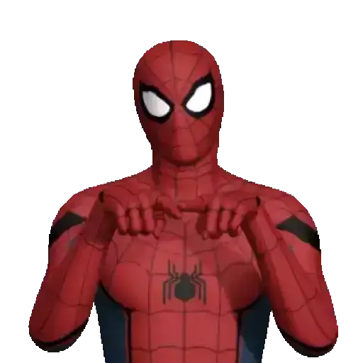 Homem-Aranha usando um celular, com expressão séria e olhos arregalados, em um fundo branco.