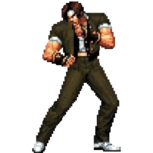 Personagem de jogo de luta com cabelo castanho, usando jaqueta azul, camiseta cinza e shorts azuis, com as pernas…