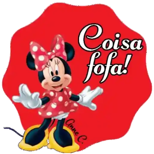 Minnnie Mouse vestida de rosa com branco, com um laço rosa com branco na cabeça e a frase 'Coisa fofa!'