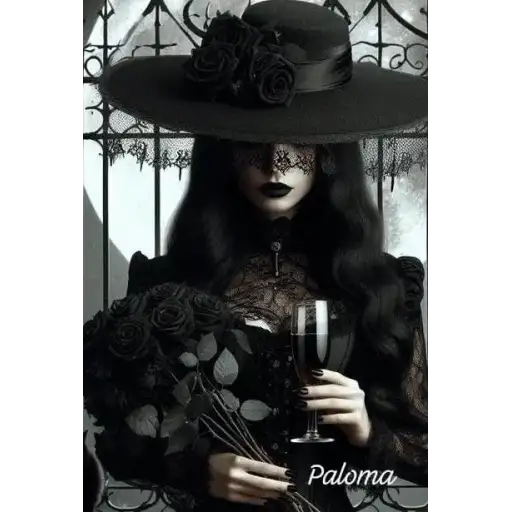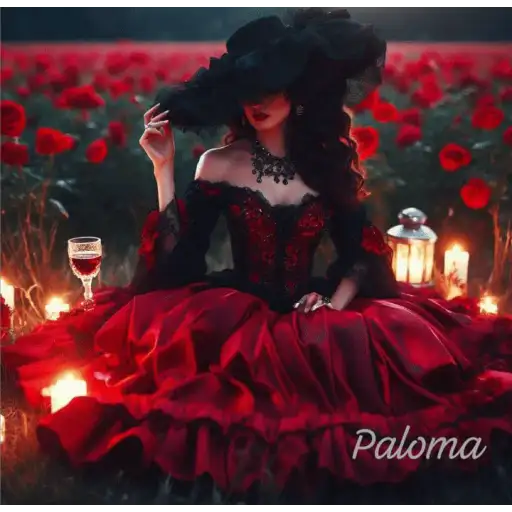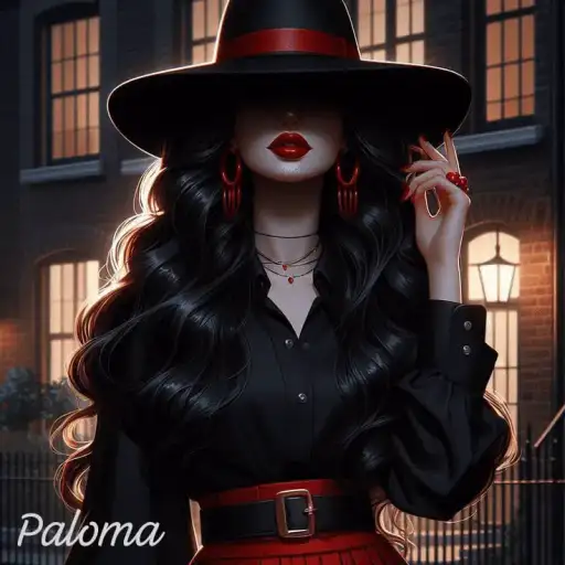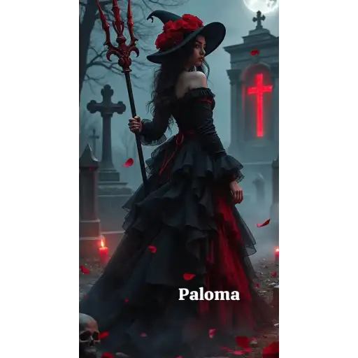 Uma mulher com longos cabelos pretos e um vestido preto e vermelho está em frente a um pergaminho iluminado. Ela parece…