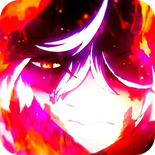 Personagem de anime com cabelo branco e olhos vermelhos em chamas, com fundo de fogo laranja e amarelo.
