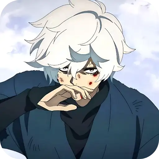Rosto de um personagem de anime com cabelo branco e olhos castanhos. Ele está usando um casaco preto.