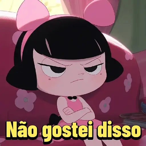 Menina de anime com cabelo preto e olhos grandes sentada em um sofá rosa, com as braços cruzados e expressão…