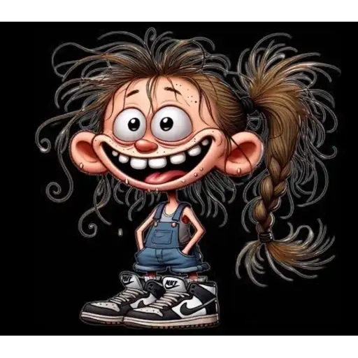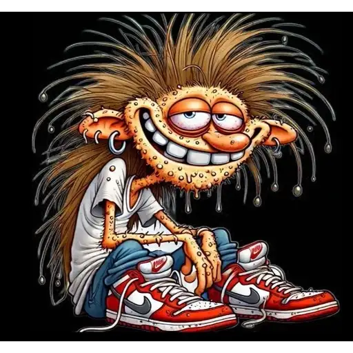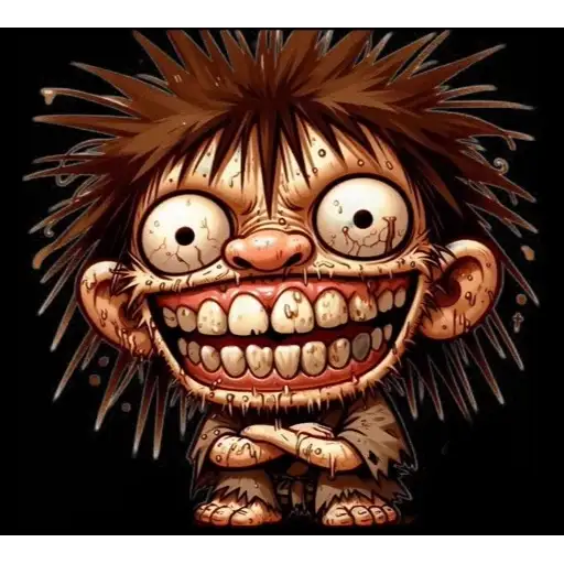 Personagem de desenho animado com cabelo desgrenhado, olhos grandes e língua para fora, parecendo sujo e desajeitado,…