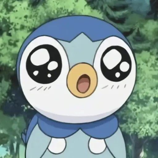 Um pinguim azul cartoon com expressão alegre e boca aberta, usando um uniforme rosa e azul, com pom-poms rosa nas mãos.