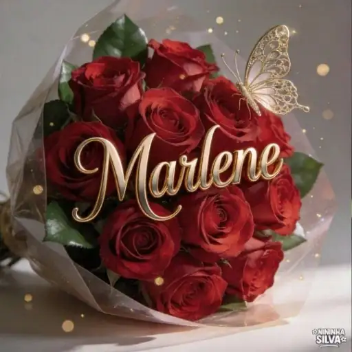 Um buquê de rosas vermelhas com o nome 'Ana' em letras douradas no centro. Há uma borboleta dourada ao lado das rosas e…
