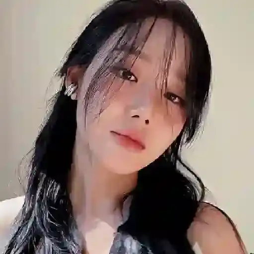 Uma jovem mulher com cabelos castanhos e um sorriso tímido, usando uma camiseta azul claro.
