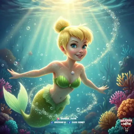 Uma mulher com busto de Snow White vestindo um sutiã azul e uma cauda de peixe vermelha, com um laço vermelho no…