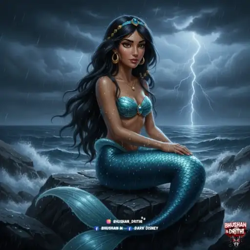 Sereia sentada em uma rocha à beira-mar, com tempestade ao fundo e um raio iluminando o céu escuro. Ela tem longos…