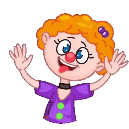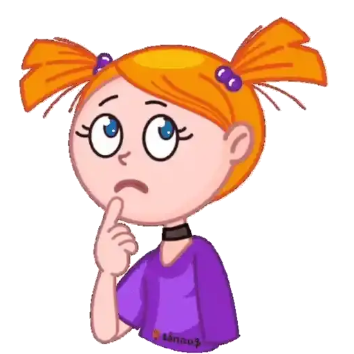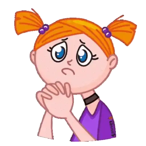 Menina de cabelos laranjas em dois coques, com expressão de desaprovação ou surpresa, fazendo um gesto com o dedo…