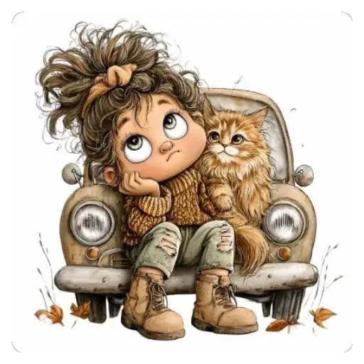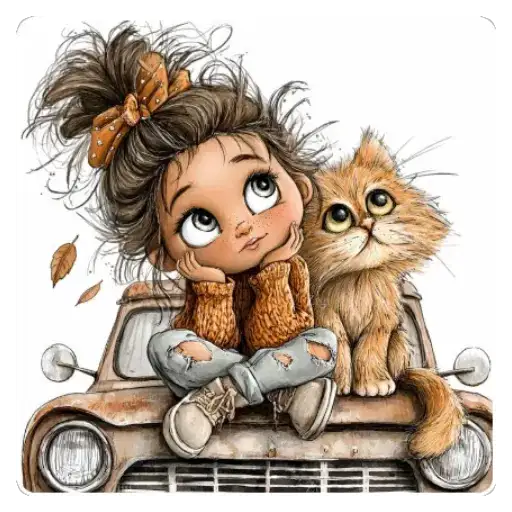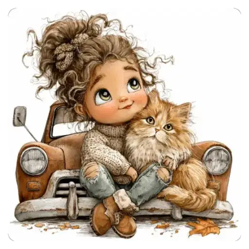 This collection features illustrations of a girl and cats in cute and cozy moments. The images show the girl interacting with cats of different breeds and colors, highlighting the friendship and tenderness between them.