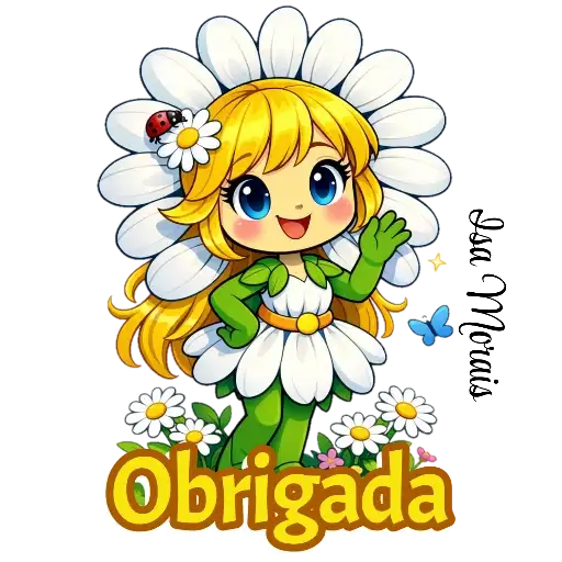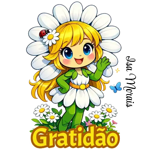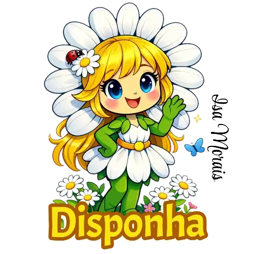 Uma menina de cabelo loiro com uma flor na cabeça e uma grande flor de margarida no vestido, com a palavra 'Disponha'…