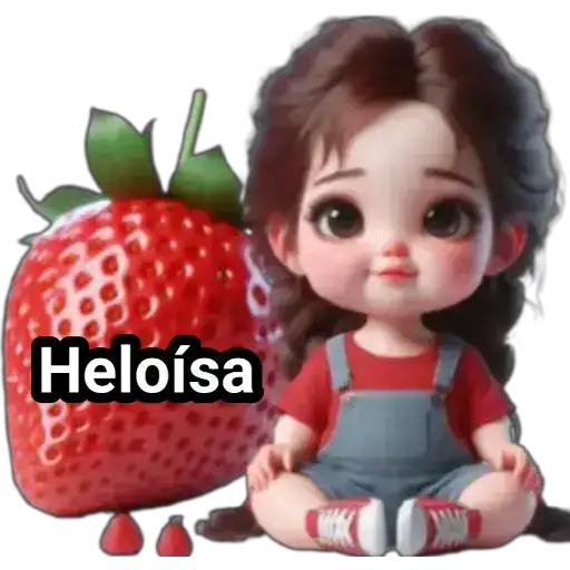 Menina de olhos castanhos e cabelo castanho sentada ao lado de uma morango gigante, com o nome 'jaine' sobreposto no…