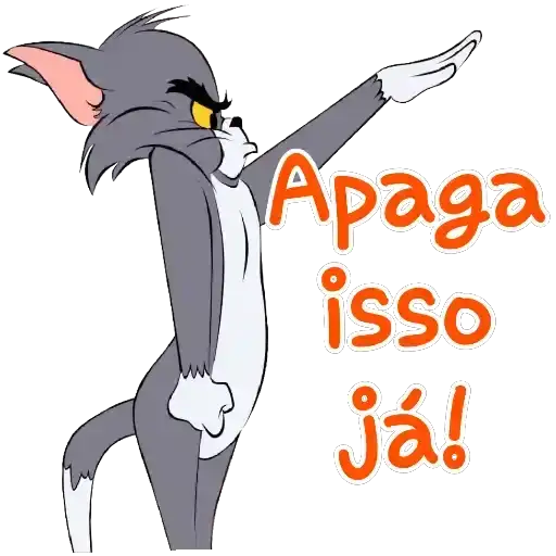 Gato Tom de Tom e Jerry com expressão brava e o braço estendido para o lado, com o texto "Apaga isso já!" em laranja.