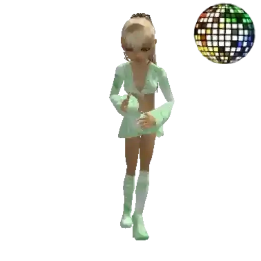 A blonde woman in a light green outfit dancing in front of a colorful disco ball.