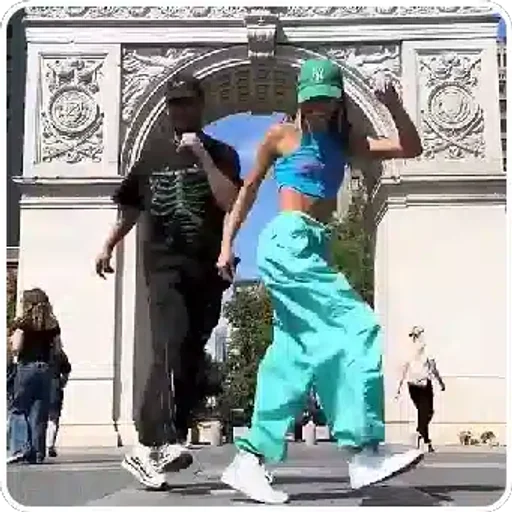 A woman dancing in front of the Arc de Triomphe, wearing a blue and green outfit, with a man in the background. She is wearing a green hat and sunglasses.