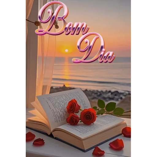 A romantic scene with an open book, red roses and petals on a table, at sunset on the beach. Overlaid, the text 'Bom Dia' in pink cursive letters.