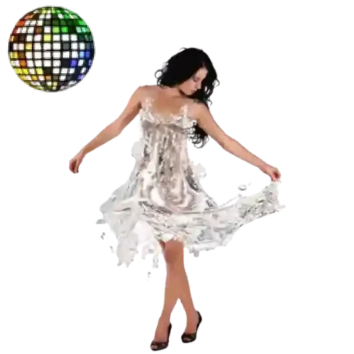 Woman dancing in front of a colorful disco ball, wearing a white dress and black shoes.