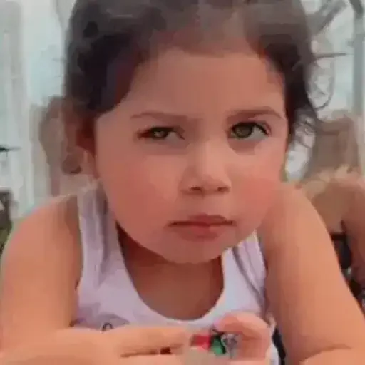 Menina com cabelo castanho e camisa rosa, fazendo careta com os olhos fechados e boca aberta, mostrando os dentes.