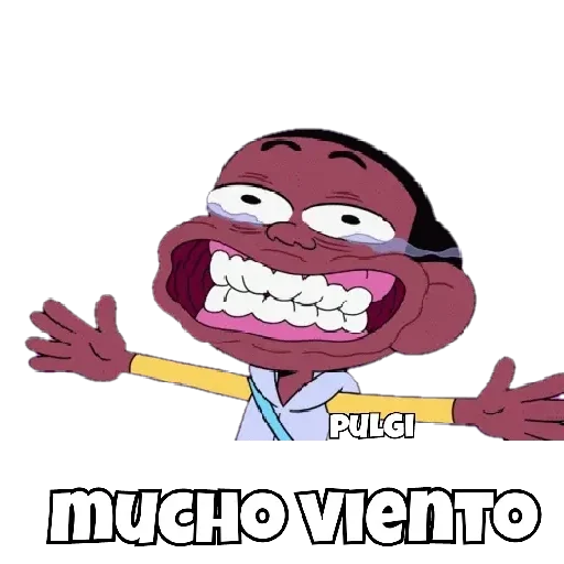 Cartoon character with open mouth and outstretched arms, smiling. He has dark skin, bulging eyes, and white teeth. Below him, it reads 'MUCHO VIENTO'.