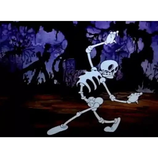 A white skeleton dancing on a dark purple background with tree shadows. The skeleton has one arm raised and the other extended to the side.