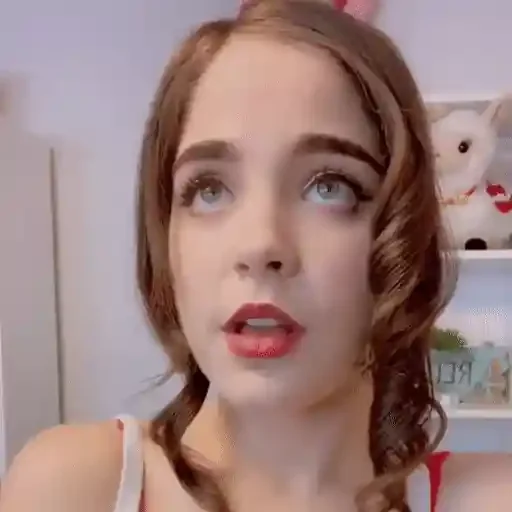 A young woman with brown hair and blue eyes, wearing a red and white top, looking at something with surprise.