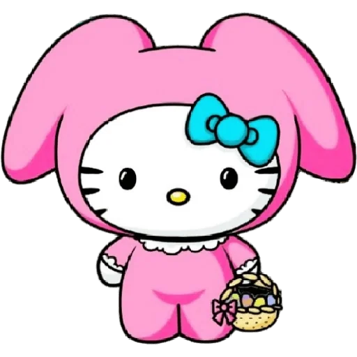 Rosto de Hello Kitty com um laço rosa, fazendo um gesto com a mão e com dois triângulos rosas atrás da cabeça.