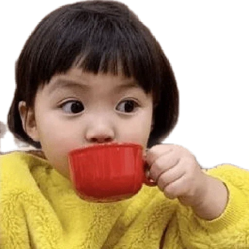 A girl with bangs and black hair drinking from a red cup, wearing a yellow sweater.