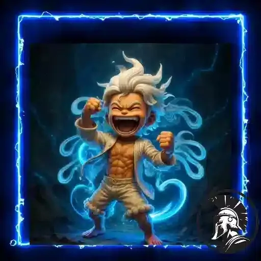 Personagem de anime com chapéu laranja e luvas de fogo, com um fundo vermelho e uma borda azul neon.