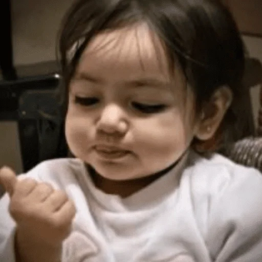 Menina com cabelo castanho e camisa rosa, fazendo careta com os olhos fechados e boca aberta, mostrando os dentes.
