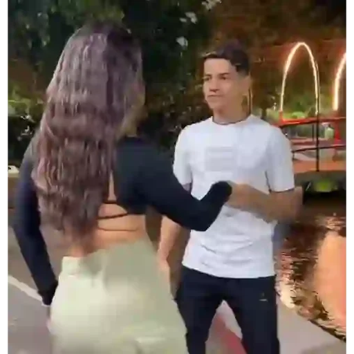 A man in a white shirt and black pants talking to a woman with long brown hair and a white dress in an outdoor nighttime setting.