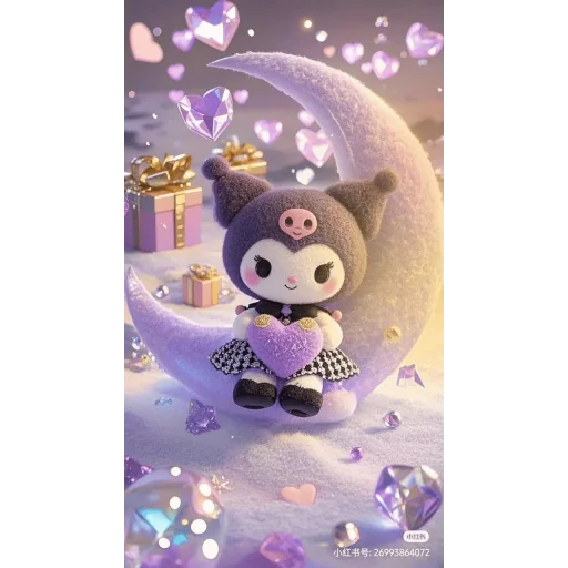 A cute cartoon character, Kuromi, sitting on the moon with a purple heart, wearing a black and white checkered skirt, surrounded by gifts and hearts.