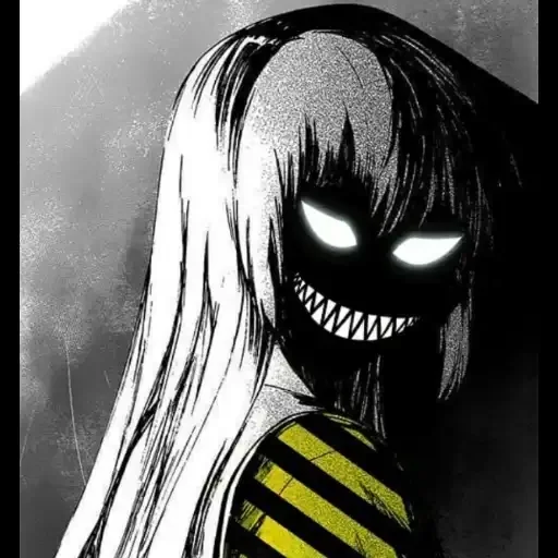 A dark figure with glowing eyes and sharp teeth, long straight hair, and a yellow and black striped shirt.