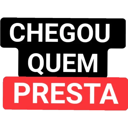 A sticker with three lines of text: 'CHEGOU', 'QUEM', and 'PRESTA', in contrasting colors. The background of the words is black and red.