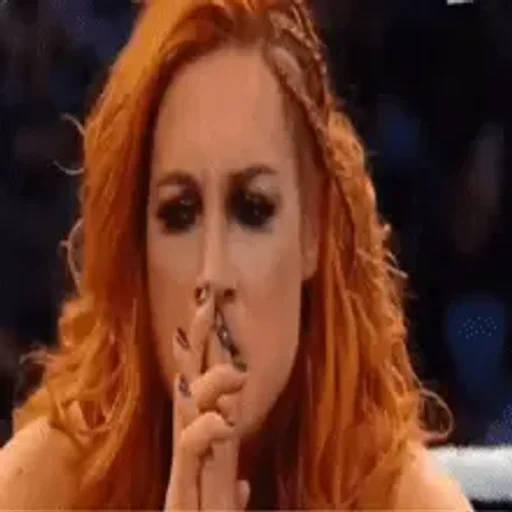 Red-haired woman with her hand on her mouth, making a gesture of silence or surprise, with wide and made-up eyes.