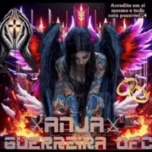 A woman with angel wings and black hair, with arm tattoos, amidst flames and colorful lights. She is kneeling and there's prominent text reading 'ROJA GUERREIRA UFC'.