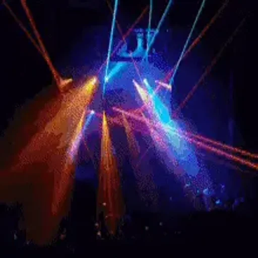 colorful light effects in a dark environment, with orange, blue and purple light beams