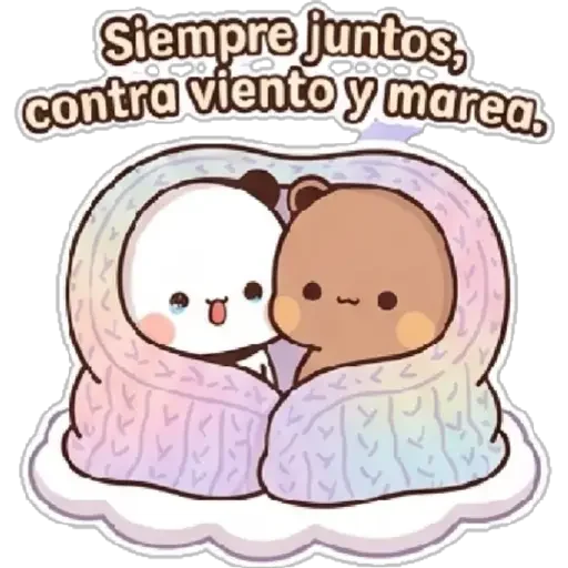 Two cute characters, one white and one brown, hugging and covered by a colorful blanket, with the phrase 'Siempre juntos, contra viento y marea' above them.