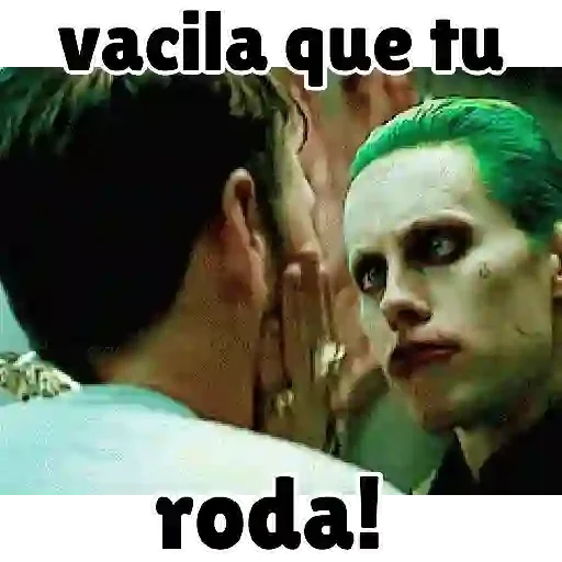 The Joker looking at someone with a mischievous expression, with the text 'vacila que tu roda!' overlaid.