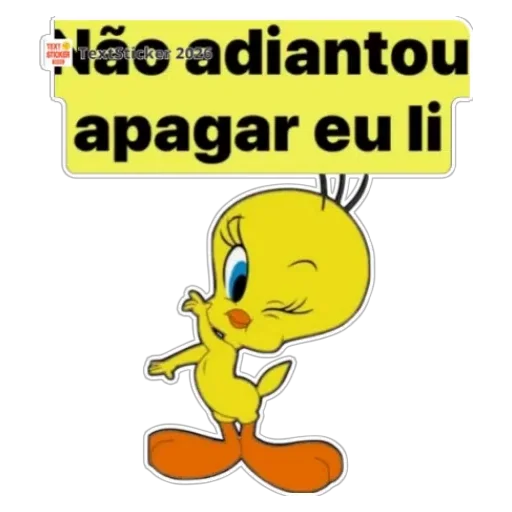 An illustration of Tweety Bird holding a yellow sign that reads 'Não adiantou apagar eu li'. Tweety has a surprised facial expression and raised hands.