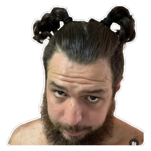 A bearded man with brown hair in two buns on top of his head, making a face of disapproval or surprise.